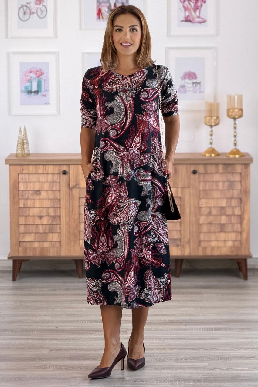 Bordo Şal Desenli Zımparalı Süet Elbise
